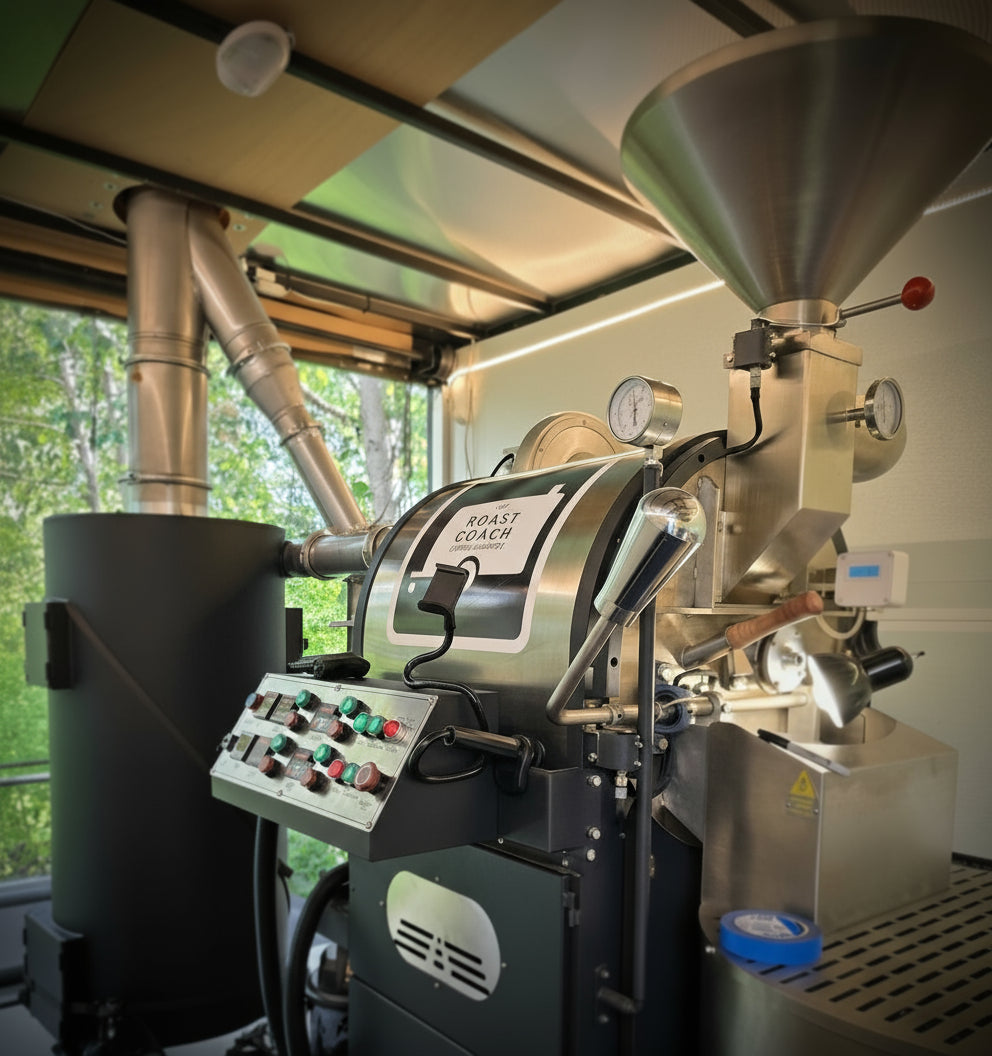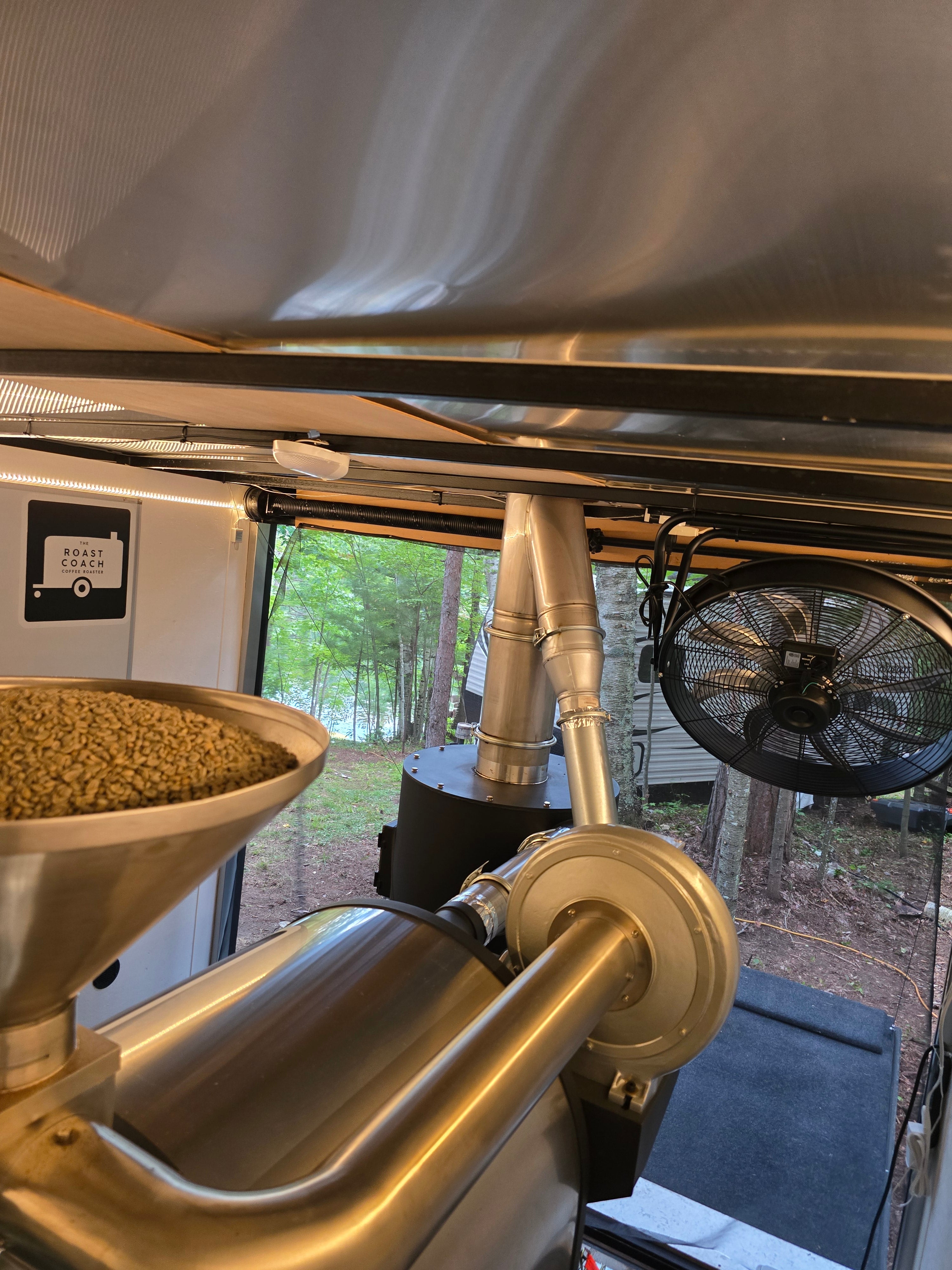 The Roast Coach is the culmination of my coffee roasting dream: a mobile, small-batch facility built specifically to maximize quality and efficiency. Though it’s only a 16-foot enclosed trailer, it packs a powerful punch, centered around our reliable 10 kg drum roaster—the same workhorse model we used to hone our profiles back in Cody, Wyoming.